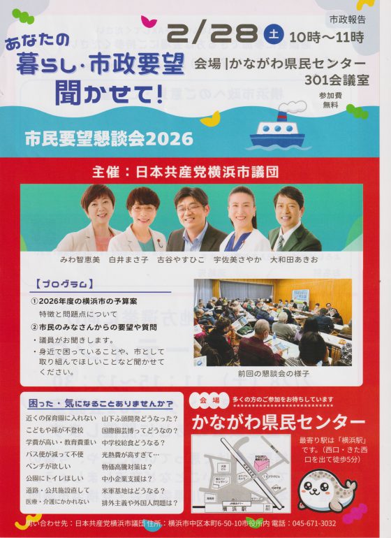 2月28日(土)10時~11時 かながわ県民センター 301会議室 主催:日本共産党横浜市議団